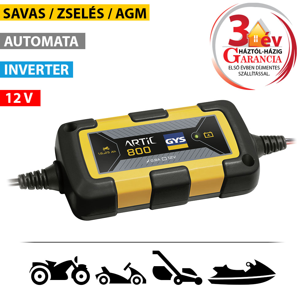 - Egyszerűsített, gombmentes kezelőfelület a hibás manipuláció elkerülése érdekében. A rákapcsolást követően az ARTIC 800 azonnal elkezd tölteni, a felhasználó beavatkozása nélkül, ha az akkumulátor feszültsége nagyobb, mint 7V.